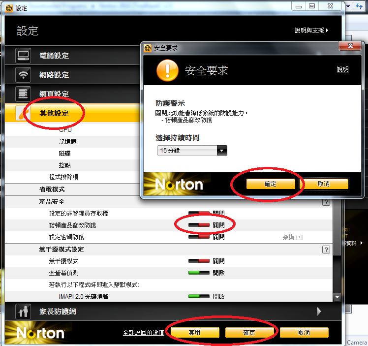 4) 關掉"產品安全"裡的第二個~ "諾頓產品竄改防護"後 按套用 > 確定 > 確定